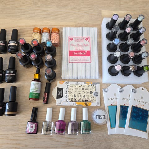 Negledesign sett med akrylpulver og diverse dekor. Inneholder flere bokser akrylpulver i ulike farger, blant annet rosa og hvit, samt prøvevifte med fargede negletipper. I tillegg følger det med ulike typer negledekor og klistremerker i flere mønstre og farger. Passer til bruk ved akrylnegler og dekorering av naturlige eller kunstige negler. Alle bokser er nesten fulle.