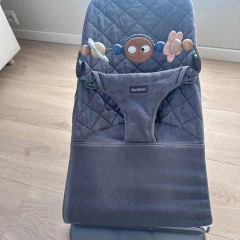 Babybjörn barnestol/babysitter i lys blå tekstil med metallstativ. Stofftrekket har integrert sele for å holde barnet på plass. Stolen er egnet for små barn som trenger støtte til rygg og hode, og kan brukes som avlastningsplass i hjemmet, for eksempel på gulv i stue eller barnerom. Tekstiltrekket kan tas av for rengjøring etter produsentens anvisninger.