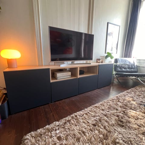Den har god oppbevaringsplass med to skap på hver side, begge med innvendig hylle. I midten er det åpen plass med glasshylle, perfekt til dekoder, spillkonsoll eller annet elektronisk utstyr.