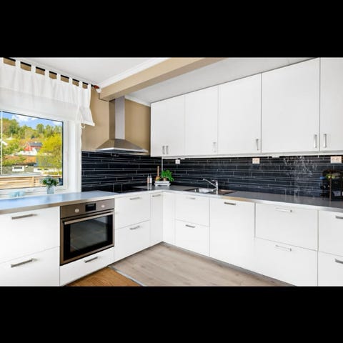 Benkeplaten er tilpasset kjøkkeninnredning med integrert platetopp og har utsparing midt på platen. Den egner seg som benkeplate på kjøkken, eventuelt på kjøkkenøy eller langs vegg, avhengig av målene som oppgis i annonsen. Hvite underskap og skuffer som vises på bildene kan være del av løsningen dersom dette er inkludert i salget, og bør eventuelt spesifiseres med egne mål og detaljer. 60cm X 359cm X 4 cm. Kjøkkenøy benkeplate 90 cmx205 cmx4 cm