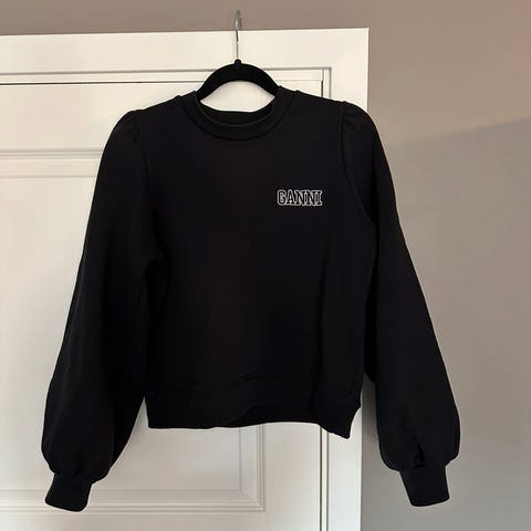 Kjempefin og enkel grå genser fra Ganni med liten logo på brystet. Myk og behagelig, perfekt til hverdagsbruk eller avslappede dager.