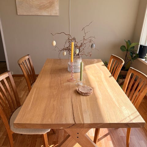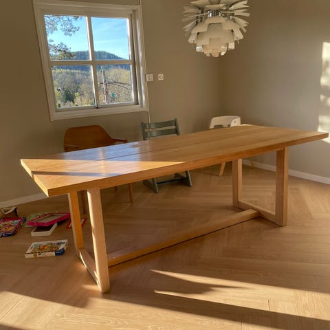 Nydelig bord, men for lite hos meg. Treet er ubehandlet, såpevasket.