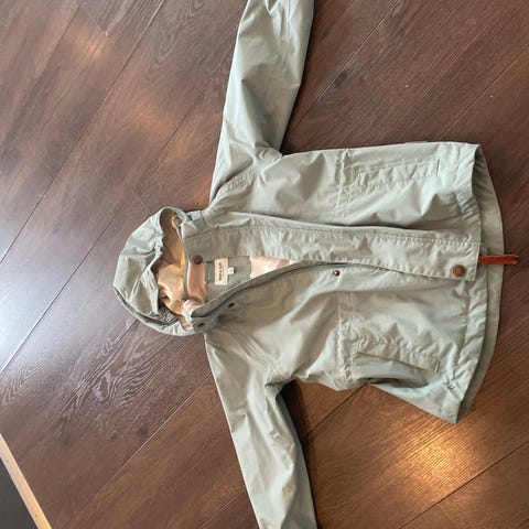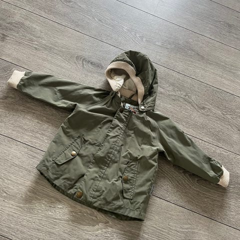 MINI A TURE jakke for barn i størrelse 110, unisexmodell. Jakken er grønn. Den har hette, glidelås med knappestolpe, ribbestrikkede mansjetter og lommer foran. Ribben har små bruksmerker ellers ser den helt ny ut.