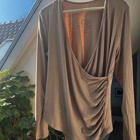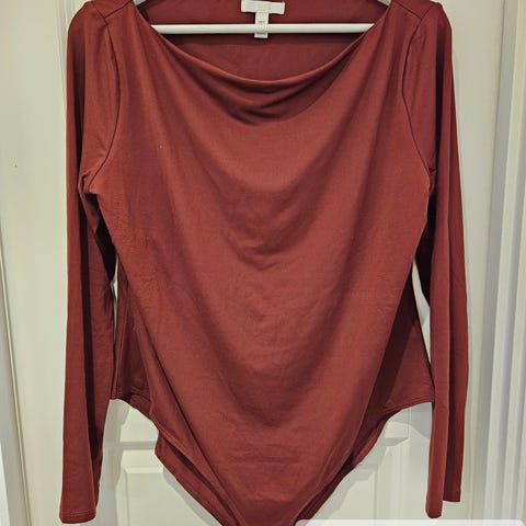 H&M genser-body for dame i størrelse XL. Plagget er laget i polyester og har lang erm. Fargen er burgunder rød. Bodyen lukkes med trykknapper nederst. Passer som enkel overdel til hverdagsbruk eller under andre plagg.
