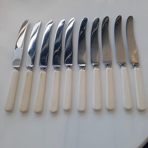 Seks pene kniver fra Skaugum med hvitt skaft. De er synlig brukt, som d t fremgår av bildene. Men de er ellers i god stand.
