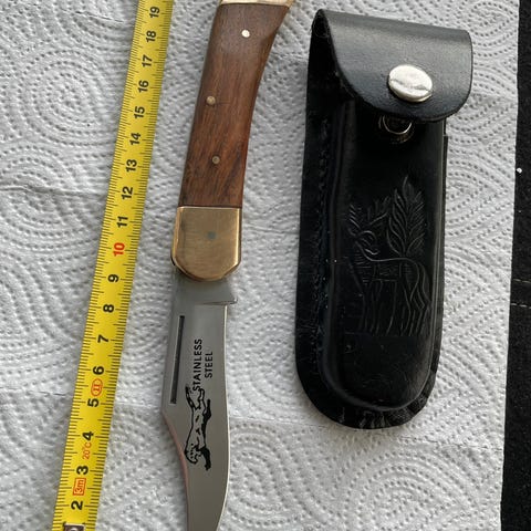 Selger en eksklusiv brukskniv fra Winchester. Den har utskåret horngrep og lærslire medfølger. Den er brukt, men de siste 25 år har jeg bare hatt den liggende som samleobjekt / "smykke" da jeg fikk vite hvor sjelden den kan være.