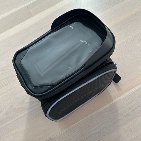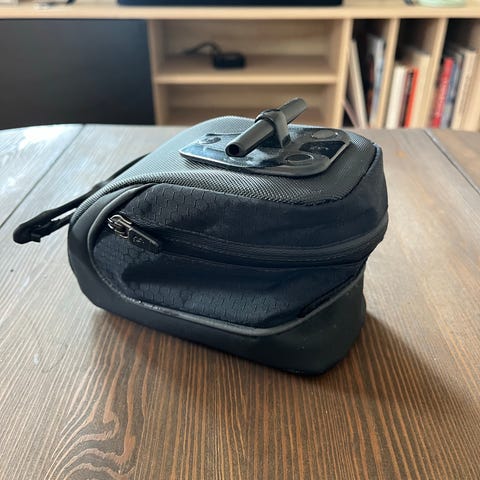 Vesken er laget i tekstil med hovedfarge svart og detaljer i blått. Den har glidelåslukking på toppen og flere hemper og festepunkter på baksiden, som kan brukes til å feste vesken på annet utstyr eller bære den i hånden. Innvendig er det lyst fôr som gjør det enklere å se innholdet.