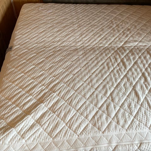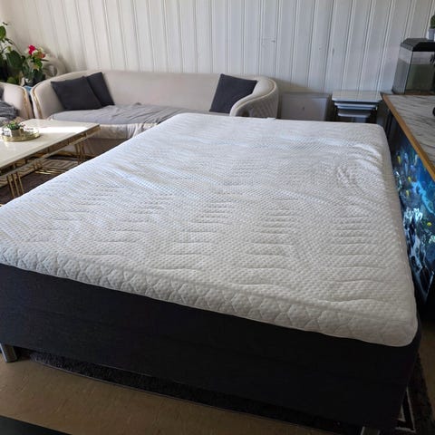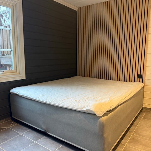 Svanen rqmmemadrass. Skeidar seng med madrass. Sengen har en madrass med tekstiltrekk i lys farge. Passer som fast sengeløsning på soverom eller gjesterom. Ytterligere detaljer om størrelse, fasthet og materiale er ikke oppgitt. 180 cm bredde og 200 cm lengde