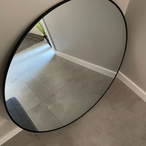Kid rundt speil med tynn metallramme. Speilet har diameter Ø70cm. Speilet har sirkulær form og en smal ramme i metall med gyllen/messingfarget finish. Passer i for eksempel gang, stue, soverom eller bad.