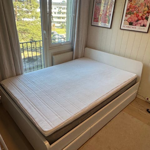 IKEA Brimnes seng 140x200 cm med integrerte oppbevaringsskuffer under liggeflaten. Rammekonstruksjon i treverk med mørk, svart overflate. Sengen har to store uttrekksskuffer på langsiden som gir ekstra lagringsplass til for eksempel sengetøy, puter eller klær. Egnet som enkeltseng med god bredde eller som dobbeltseng i mindre rom. Passer godt i soverom, gjesterom eller hybel hvor det er behov for både seng og oppbevaring på begrenset plass.