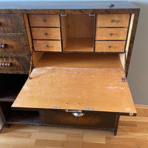 Noen merker på skrive-klaffen fra forrige eier. Klaffen kan slipes ned og lakkes igjen.