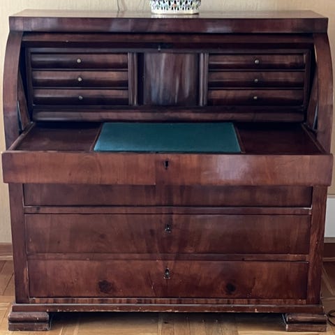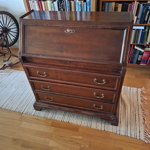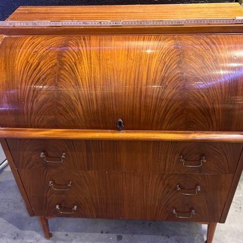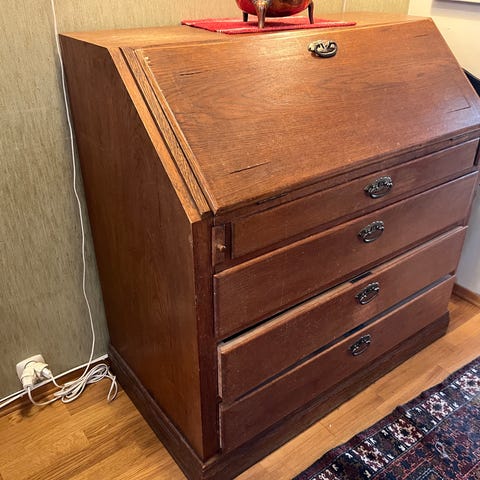 Skatollet har tre store skuffer og 10 små skuffer og et lite, låsbart rom som avdekkes når man slår skriveklaffen ned.