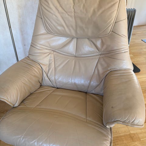 Fra midten av 1970-tallet har denne stolen gått i arv. Designet av Henry Walter Klein og produsert av Bramin i Danmark. Den er i lyst skinn og fullt funksjonell. Etter å ha vært brukt i 50 år er den i bemerkelsesverdig god stand. Det er noen slitemerker, og skinnet hadde antagelig hatt godt av en dyp rens. Noen særlige andre skavanker er det ikke. Recliner-mekanismen fungerer, det er ikke noe som knirker, og den er god å sitte i. Vi moderniserer og det er på tide at den får et nytt hjem, for de neste 50 år.