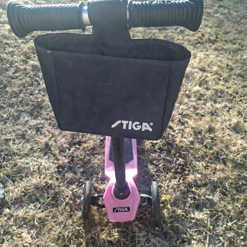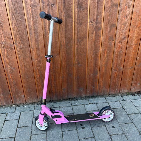Rosa Stiga sparkesykkel junior. Med bakbrems, støtte og justerbar lengde. Den kan bli max 95cm høy, og minnimum 80cm høy.