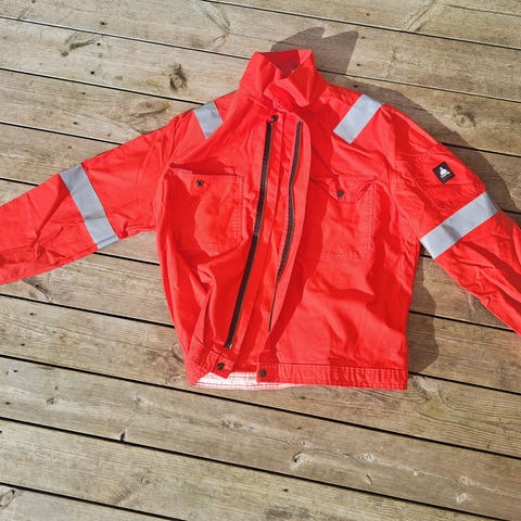 Signalgul arbeidsjakke til herre med mørke og refleksdetaljer selges. Merke Djupvik. Model 274P76ATC. 79% bomull, 20% polyester, 1% AT. Se gjerne mine andre annonser også.