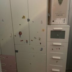 Skapet har to dører med integrerte håndtak i hvit plast. Egnet til oppbevaring av barneklær og tilbehør på barnerom.