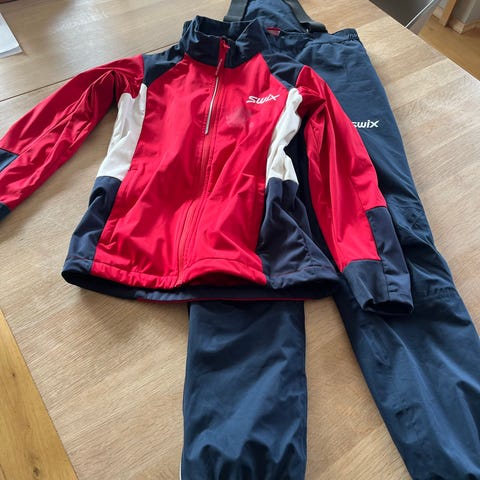 Kjempefin Swix langrennsdress (bukse og jakke) str 12 år. Denne er lite brukt, så bortsett fra litt nupper (vises på bilde) er den helt uten slitasje eller bruksmerker. Både jakke og bukse er vindtett softshell med høy ytelse for juniorer.