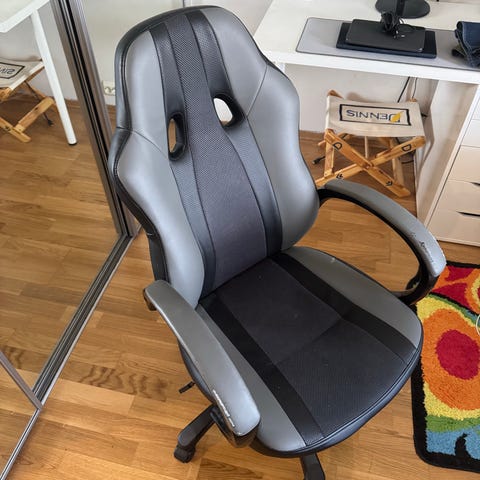 Kontorstolen har høy rygg med integrert hodestøtte og åpninger øverst i ryggen. Sete og rygg er polstret, med armlener på begge sider. Stolen har et formspråk som minner om en racing- eller gamingstol.