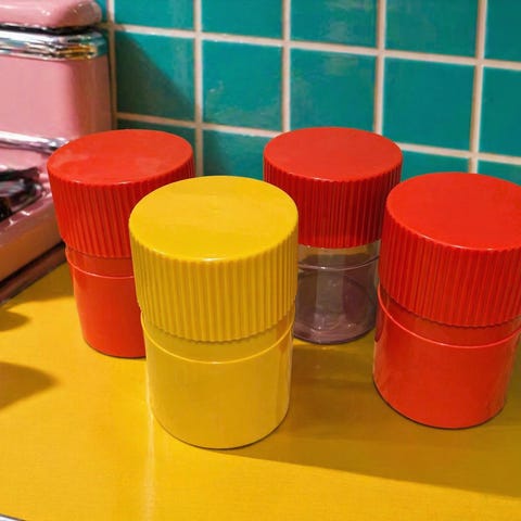 Vintage salt- og pepper sett i rød transparent plast, trolig fra 1980-tallet. Settet består av to salt- og pepperbøsser og en holder med integrert tannpirkerdispenser med lokk. Når man trykker på knappen på siden av dispenseren kommer én tannpirker ut av gangen. Måler ca. 12 × 14 cm i basen og 16 cm i høyden. I veldig fin vintage stand med kun små tegn til bruk.