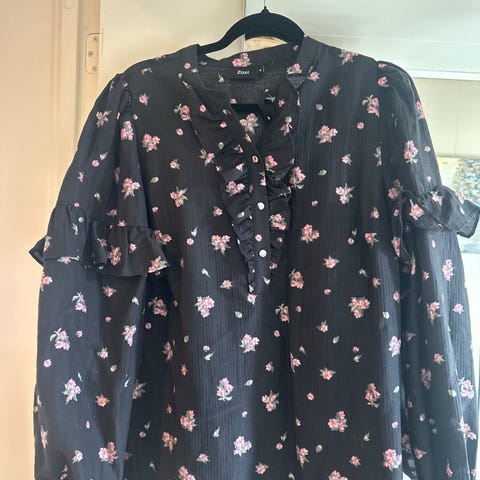 Days Like This bluse i størrelse M for dame. Blusen er i rød polyester med småmønstret trykk. Den har lange ermer med strikkede mansjetter og lett gjennomsiktig ytterstoff med underlag. Halsen har rysjedetaljer og lukkes bak med knapp. Passer til bruk i hverdagen eller til enklere penere anledninger.