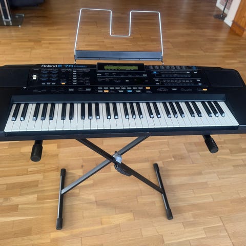 Yamaha keyboard med innebygde høyttalere og display. Mulig å koble til headsett. Keyboardet står på et justerbart X-stativ som følger med. ulike funksjonsknapper for lyder, rytmer og innstillinger, Egner seg til øving hjemme, undervisning eller generell musikkbruk.