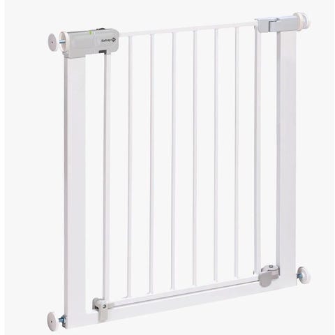 Selger en solid og praktisk sikkerhetsgrind i hvit metall.