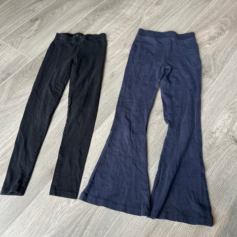 Fra Zara og KappAhl. To par myke og elastiske bukser for jente i størrelse 134. Buksen er i bomull og har flerfarget design. Passer til hverdagsbruk og kan kombineres med ulike overdeler. Materialet gir et mykt og behagelig plagg for barn i denne størrelsen.