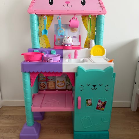 Gabby' Dukkehus Cakey Kitchen er et herlig lekekjøkken med over 20 tilbehør, 20 lyder og fraser som gjør lekestunden magisk morsom! Kjøkkenet er over 91 cm høyt, laget av plast og passer perfekt for de som elsker TV-serien Gabbys Dukkehus.