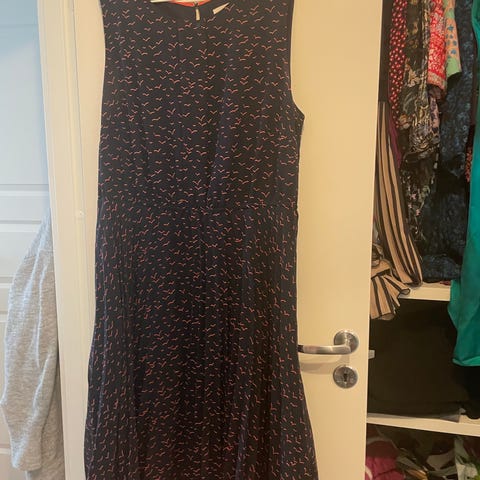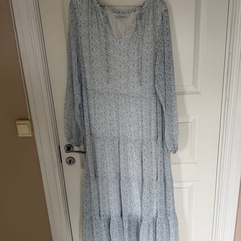 Cubus sommerkjole for dame i størrelse XL. Kjolen er blå med mønster og har V-utringning. Modellen har lange ermer og lett rynket/volangdetalj i livet og nederst på skjørtet. Materialet er polyester, som gir et lett og fallende uttrykk. Passer godt til bruk vår og sommer, eller til hverdags og enkle anledninger.