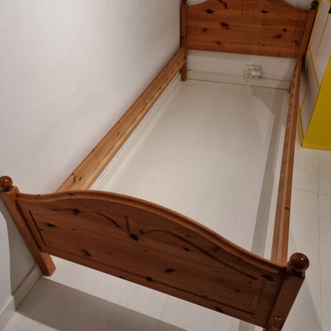 Furuseng i King-Size (183x213) (Madrassmål) opprinnelig vannseng, nå i bruk med vanlige madrasser som er spesialtilpasset King-Size. Madrasser kan medfølge. Sengen er 15 år, madrassene brukt med madrassbeskytter. Sengen er kjøpt på Sengemakeriet, angitt som Ikea da «Sengemakeriet» ikke kan velges i Finn. Må hentes