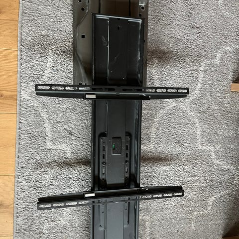 Kraftig uttrekkbart veggfeste til TV. Jeg kjøpte det til en 55" Tv og da kunne TV vris 90grader ut fra veggen. Med større TV kunne man ikke vri TV fullt 90 grader, men ganske langt uten problemer.