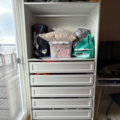 IKEA garderobeskap med skuffer og åpne hyller i hvit utførelse.