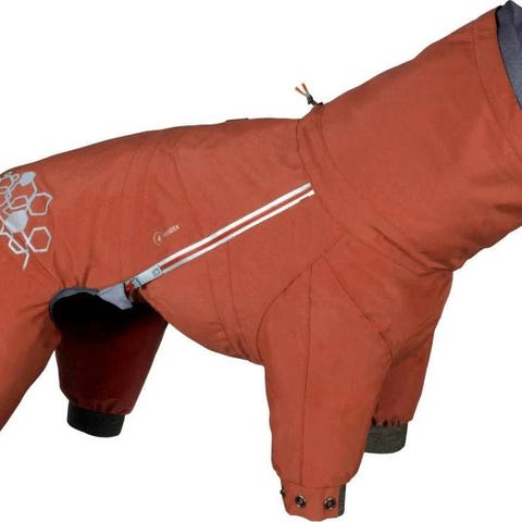 Rukka Proff hundedress i grønn farge. Heldress som dekker kropp og bein, med høy krage og strikk ved beinåpninger for bedre passform. Glidelås langs ryggen for enkel av- og påkledning. Egnet som ytterplagg for hund ved kjølig og fuktig vær, og gir beskyttelse mot vind og smuss under tur og aktivitet.