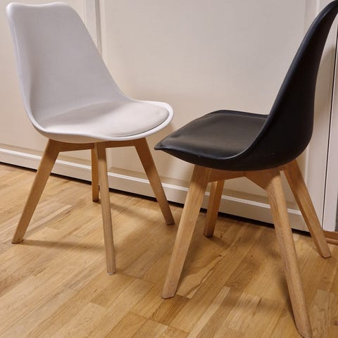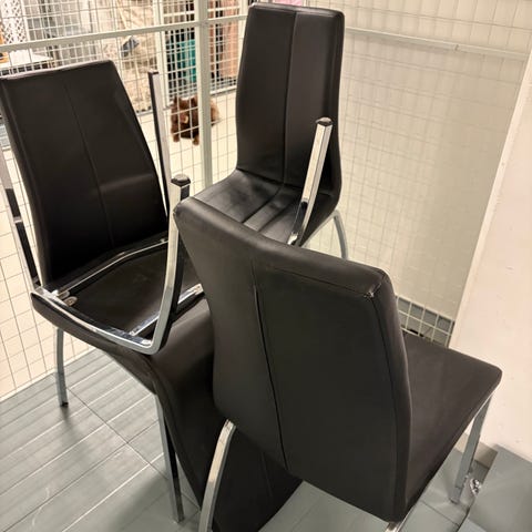 Pent brukte stoler med ben av solid tre og svart sete av plastikk. Sete er komfortabelt og har pute i imitert skinn.