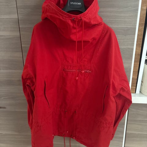 Åsnes anorakk for dame i størrelse S. Jakken er rød og har halvlengde glidelås i front, justerbar hette og snøring i livet og nederkant. Modellen har stor lomme på magen med klaff.