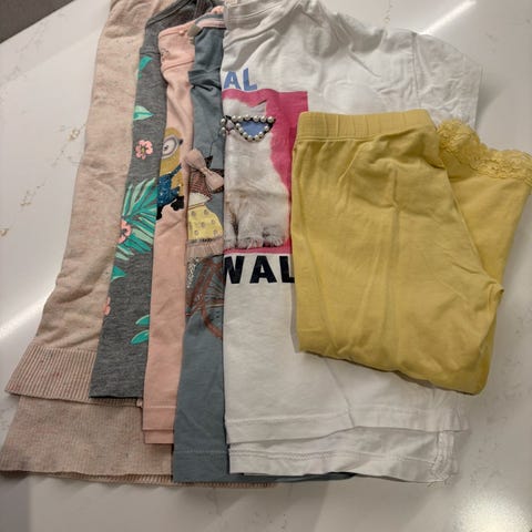 Klespakke som innerholder 2 kjoler, ett skjørt, 2 gensere, en singet og en dongeribukse.