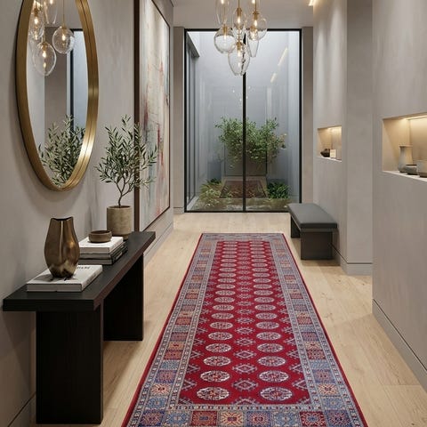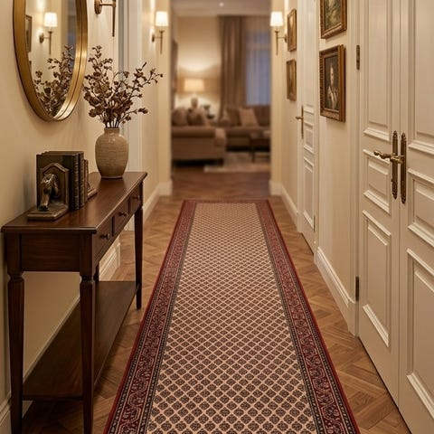Teppet har et elegant og tidløst mønster i lyse beige- og blåtoner, og passer perfekt i gang, entré, stue eller soverom. Det gir rommet et eksklusivt og varmt uttrykk med en gang.