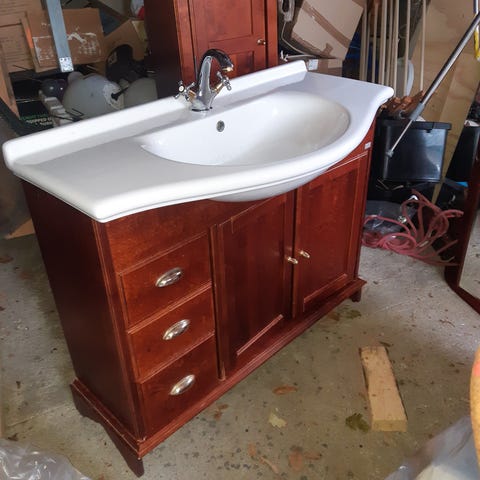 Baderomsinnredning med servant, blandebatteri og speil, rød