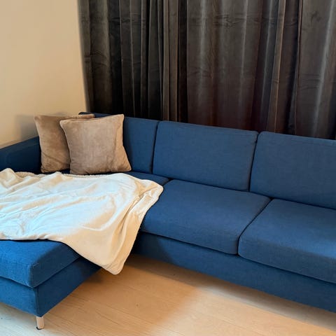 Fin STAY sovesofa, 3-seter med divan og nakkestøtte. Sofaen er i fargen "charm blå". Den har oppbevaringsmagasin med plass til sengetøy el.