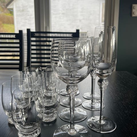 14 rødvin og 6 snaps selges billig. Fremstår veldig pene og hele. 1.500,- for rødvinsglass og 800,- for snapsglass.