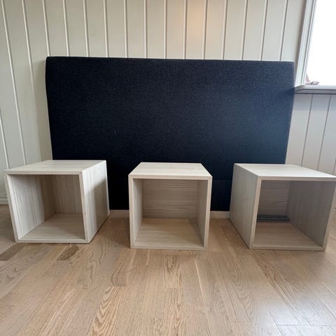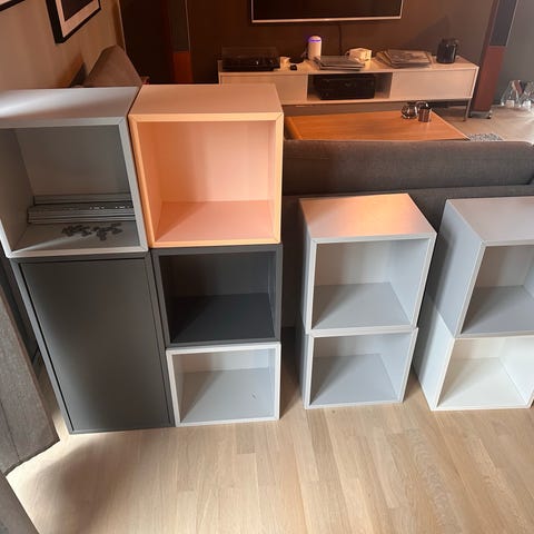 Selger 3 stk IKEA EKET-hyller, inkludert veggskinner. Aldri vært montert på vegg. Hyllene er svært lite brukt.
