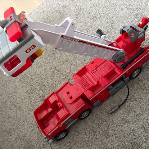 Paw Patrol Marshall brannbil lekebil i rød og grå plast med figuren Marshall i førersetet. Bilen har bevegelige deler bak som kan løftes opp. Lekebilen er laget for barnelek på gulv og andre flate underlag, og passer inn sammen med andre Paw Patrol-figurer og kjøretøy fra samme serie.