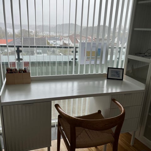 IKEA skrivebord i hvit utførelse. Skrivebordet har en stor, rektangulær bordplate og understell med skap på begge sider. Hvert skap har hylleplass på innsiden av dørene. I midten under bordplaten er det en uttrekksskuff for oppbevaring av mindre gjenstander. Laget i plate-/trebasert materiale med malt overflate i hvitt. En skinne på skuffen er skadet og det anbefales at man ordner ny skinne til denne. Ligner IKEAs IDANÄS som koster kr 4800.