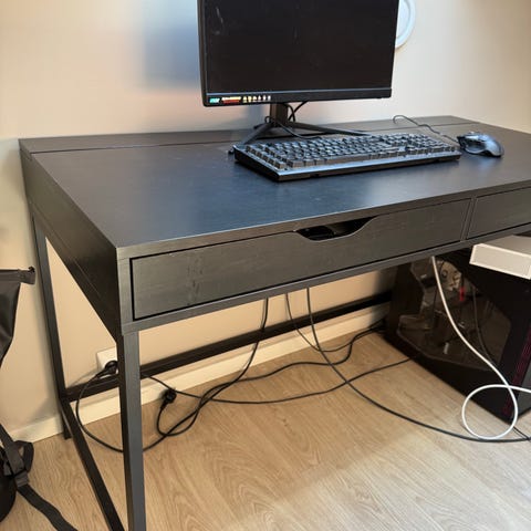 Skrivebordet er delvis demontert for enklere transport, men kan settes sammen før henting om ønskelig.