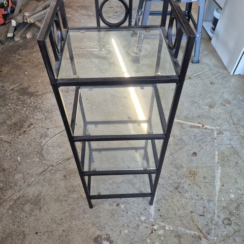 Øverste hylle har en glassplate, de andre to hyllene er av svart metall.