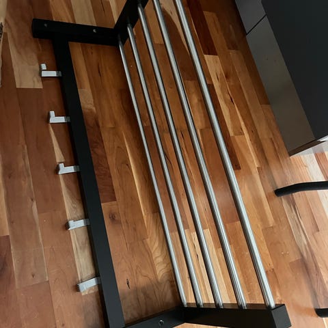 Svart hyllesystem av metall fra Ikea.