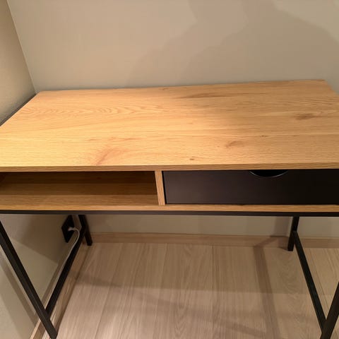 Pent brukt skrivebord med to hyller og en skuff. Litt ødelagt på en metallstang mellom bena, men det påvirker ikke bruken. Må hentes hos meg på Hovseter i Oslo!