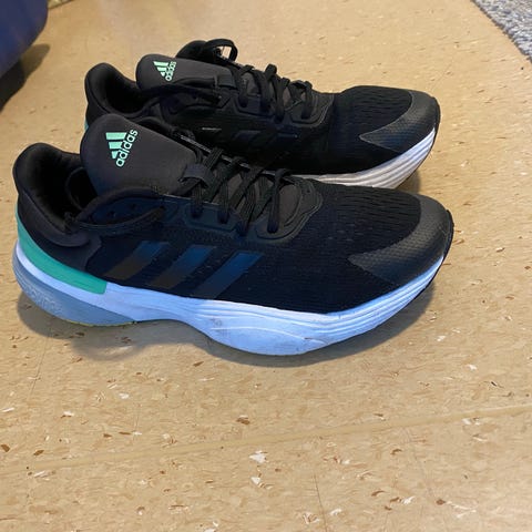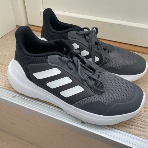 Adidas joggesko unisex i størrelse 38. Skoene er svarte med hvite Adidas-striper på sidene og lys såle. Overdelen er i syntetisk materiale med snøring foran. Yttersålen har mønster som gir godt grep. Passer til hverdagsbruk og fritidsaktiviteter for barn og ungdom som bruker størrelse 38.