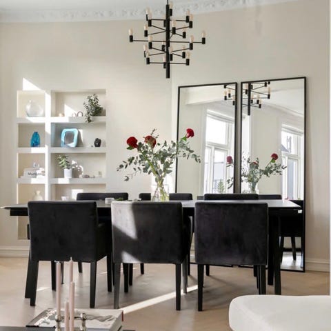 Selger en buet gulvlampe i sølv med svart skjerm. Må hentes!
