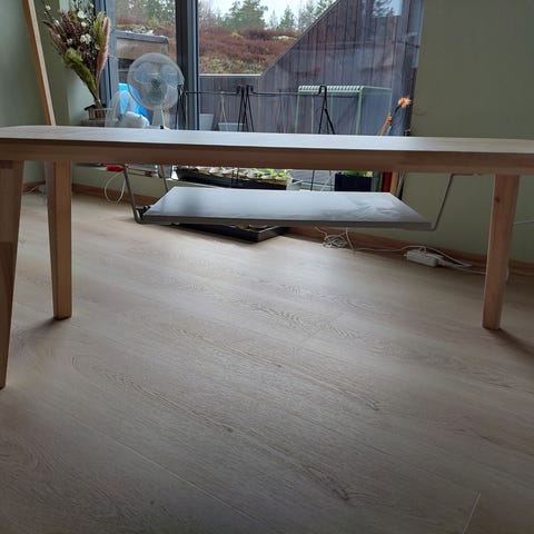 Kalby spisebord fra Jysk, kommer med 2 ileggsplater. Med begge plantene kan man sitte opptil 10 stk rundt bordet. 2 stk på hver ende.